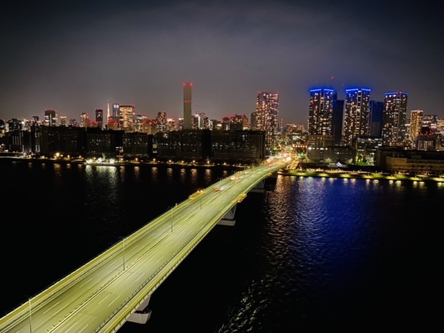 橋の向こう左手には晴海埠頭があり、クルージングの船が行き来しています。